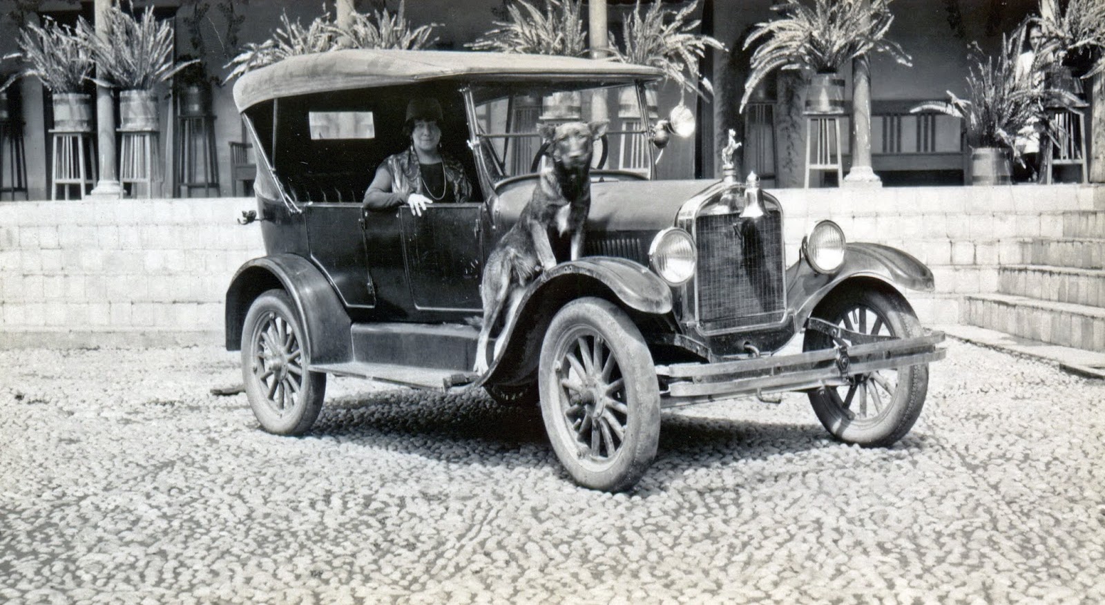 La Sra. María Letona con su auto Ford Modelo T-1921, según el Club del Automóvil Antiguo de Apurímac. Nótese el singular emblema, encima de la campana. Subido al tapabarro, un hermoso perro de la raza antigua de Pastor Alemán, de la variedad ganadora de Roland Von Starkenburg, según el Médico Veterinario Carlos Alfaro Pinto.